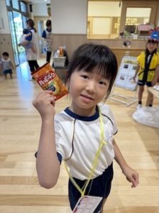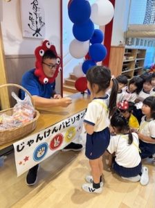 副園長先生とのじゃんけんに買ったら、お菓子をもらえるよ!負けたらまた列に並び直し…みんな真剣勝負です!