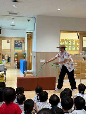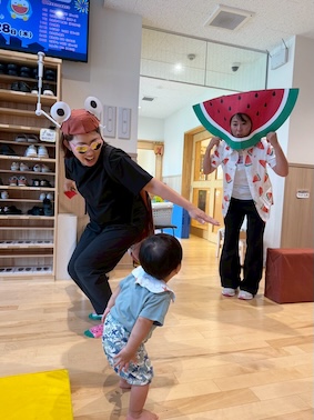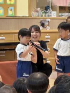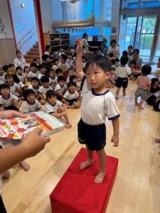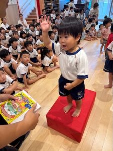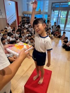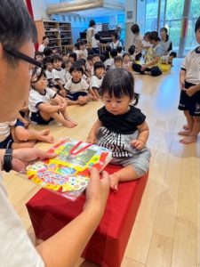 かわいいハプニングのあと、緊張がとけたのか、8月生まれのお友だちは上手にお返事をしてプレゼントをもらうことができましたよ〜!みんな素晴らしい♪