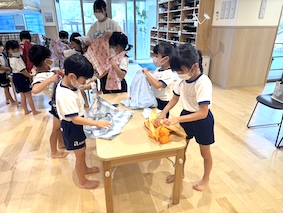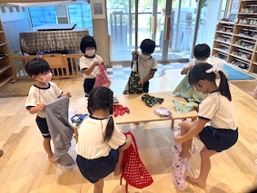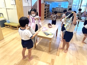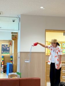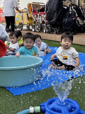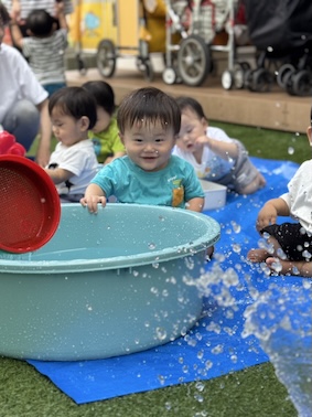 ジョウロやコップ、先生たちの手づくりオモチャ、さらに氷などいろんな水遊びグッズが登場するので、毎日飽きずに楽しく涼を感じています。