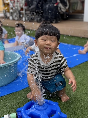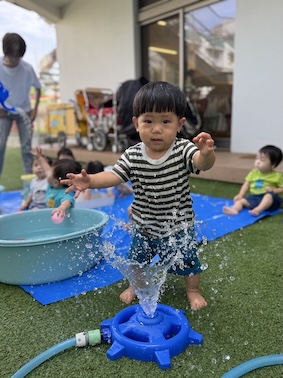 1階園庭の人工芝は、午前中日陰になっているので暑さを感じつつも楽しく水遊びができる環境となっています。