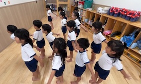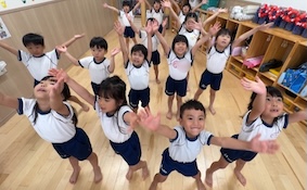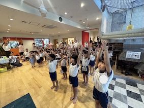 アネックスこども園では、夏の恒例「ラジオ体操」をみんなで毎朝行っています。