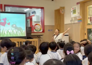 毎朝、先生が音読する歌詞をみんなで「復唱」しています。