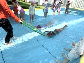 プールの時間を楽しみにしている子がたくさんいましたね、みんな顔をつけられた時、泳げた時の達成感キラキラ笑顔でした。