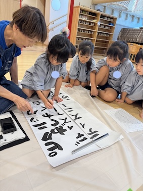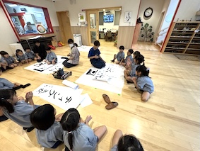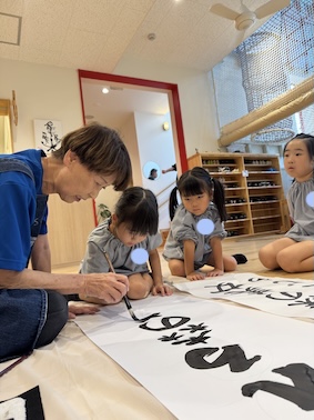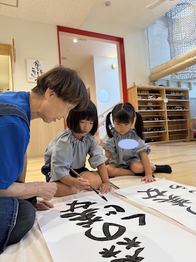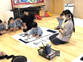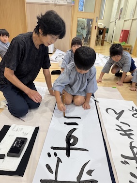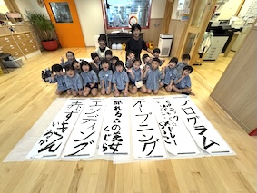 エントランスでは、大きな紙を広げて、いつもより大きな文字に挑戦しますよ。
