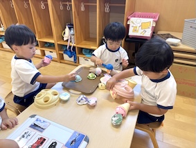 長時間の保育となるお友だちもたくさんいますので、そんな中で色んなことに興味を持って欲しいという先生の願いが手作りおもちゃ作りにつながっていると思います。