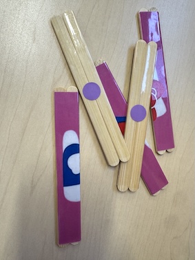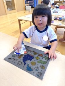 そして、ホワイトボードを使って「絵合わせカルタ」「電車の線路」などなど、たくさんの手作りおもちゃがぽっけ組にはあります✨