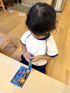 子どもたちに人気のキャラクターを、組み合わせて完成させるのですが、これが思ったより難しくて子どもたち一生懸命に挑戦しています。