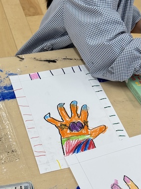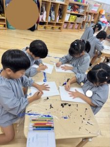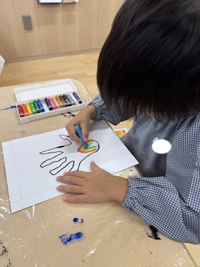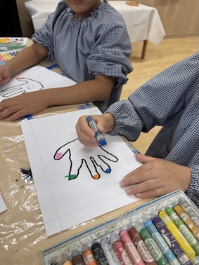 その手の中を「クレヨン全色使って好きなものを描こう!感じたことをそのまま描こう!芸術を爆発させましょう!」とお話をすると…最初は戸惑いつつも、だんだんとペンを進め、お友だちとも笑い合い・・・