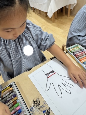 自分の手をじっくり観察して自分の手形を鉛筆で描いていきます。