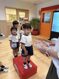 4月から誕生会を見てきたみんなは、この時を楽しみにしていたようで、9月生まれ全員、自分で誕生日台の上にのって、両手でプレゼントを受けとることができましたよ!素晴らしい♪