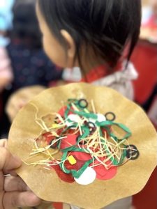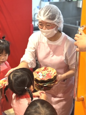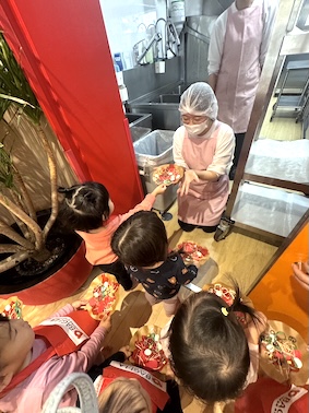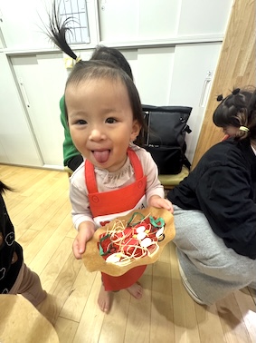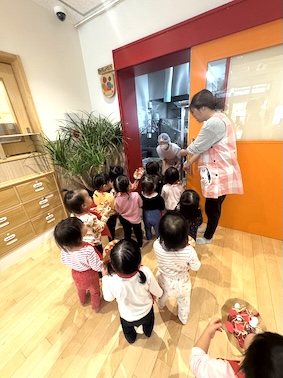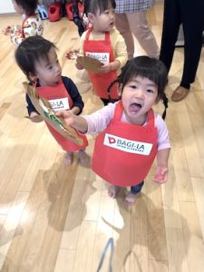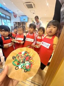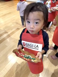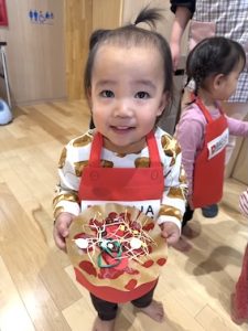 1歳児「ばぎー組」が、お部屋でピザの製作を行っているのは知っていましたが、またさかデリバリーしてくれるなんて〜❤️ありがと〜と受け取りました。