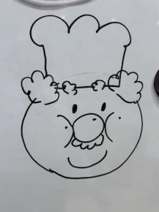 得意なお絵描きでアンパンマンを描いていると思ったら、途中からジャムおじさんに変身しました!上手に描いた絵に、みんなで「ウマイ!ヒヒーン」のポーズ♪