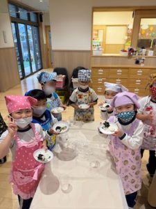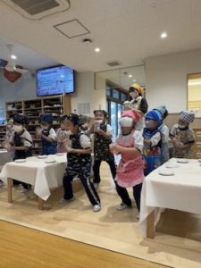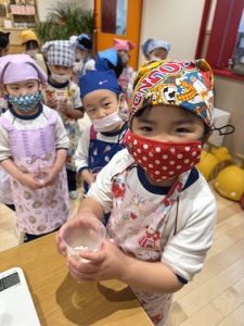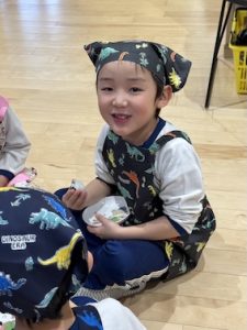 お家でエプロンに三角巾を自分で着脱する練習をしてきてくれたといういるか組、みんなでドヤ顔で着替えられました✨