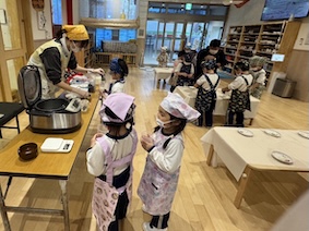 「ジャンボリミッキー!!!」の歌でノリノリ、ふりふり、紙コップに入ったご飯を丸めていきます。