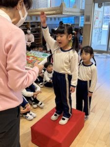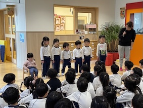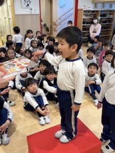 乳児クラスの子も、「○○くんです」自分のことを「くん」や「ちゃん」をつけて呼ぶお友だちもいれば、苗字だけを答えるお友だちと、それぞれかわいさがありました。