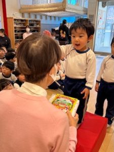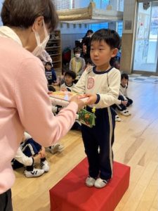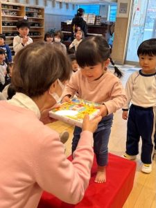 小さなお友だちから渡していきますが、トップバッターの2歳になったお友だちが「ありがとう」としっかり言えたので、続くみんなが上手にお礼を言えていました✨