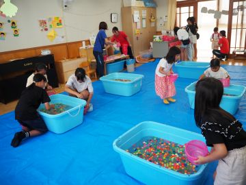 中央の透明ビニールシートに玉入れします!