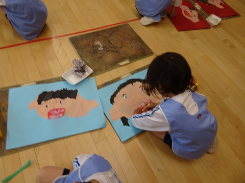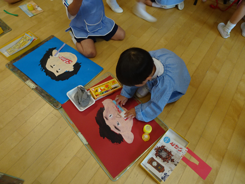 年中さんは水彩えのぐで描いた顔の輪郭にクレパスで目や髪の毛、そして、口の貼り絵に歯を加筆して、