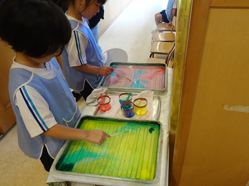年長さんは水に絵の具を垂らし、割りばしで少しかき混ぜて、
