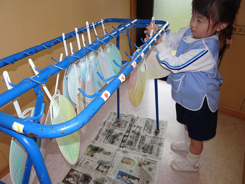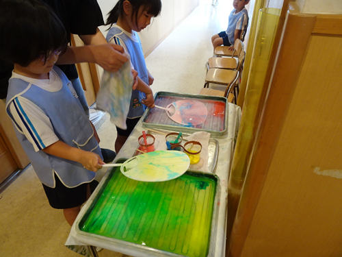 ウチワを浸けて、模様をつけました。