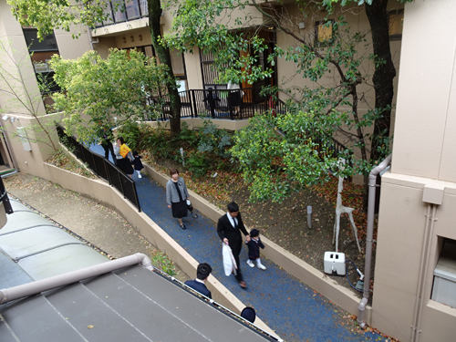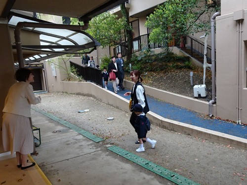 お家の人と手を繋いで、制服を着た新入園児さんが登園して来ました。