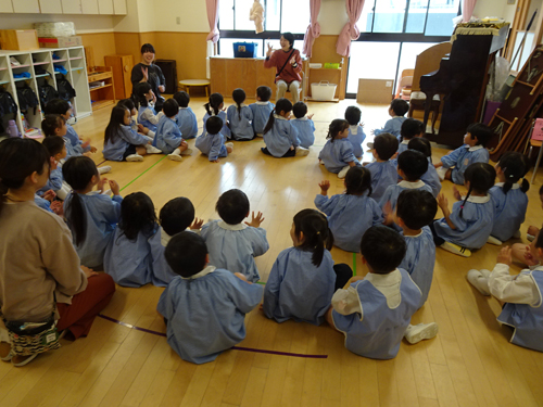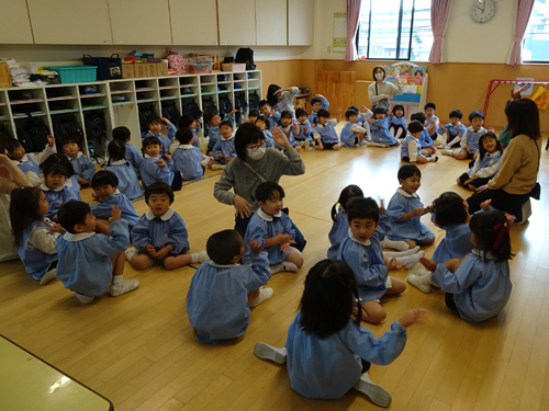 今日は年中さんが4グループに分かれて、年少さんのそれぞれのお部屋に遊びに来てくれました。
