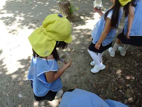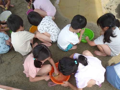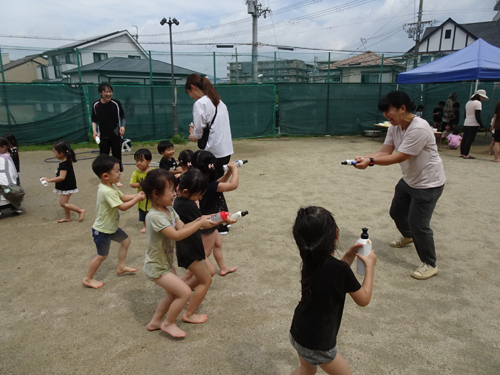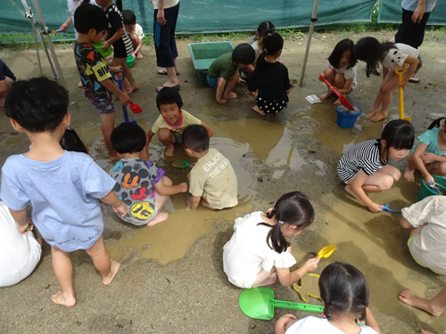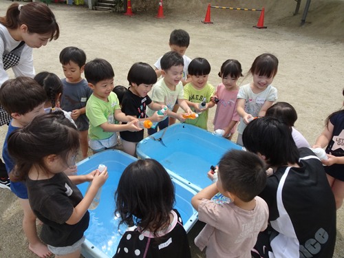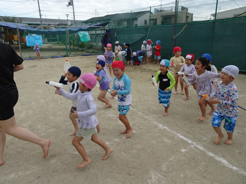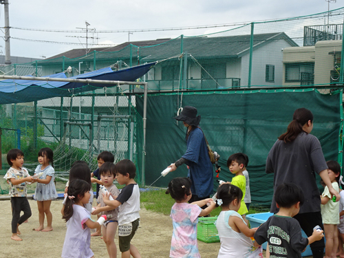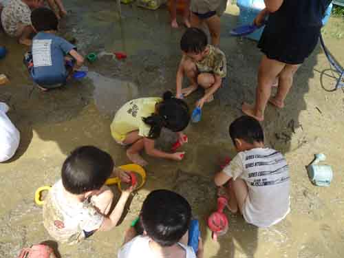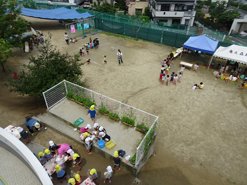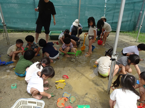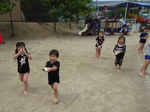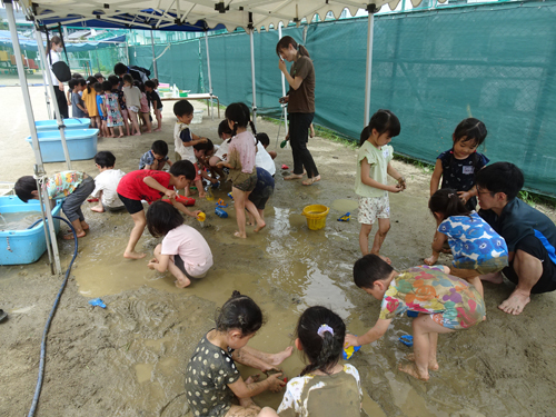 年少さんは園庭で夏の水遊びや泥んこ遊びをしました。