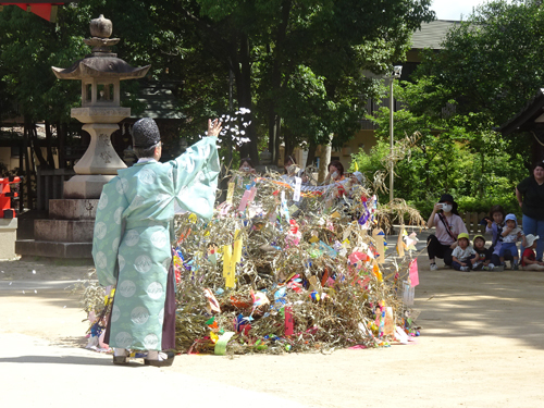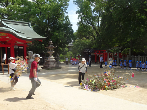 今日は境内に飾っていた大笹飾りを集め、笹送りをしました。
