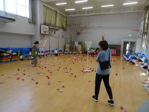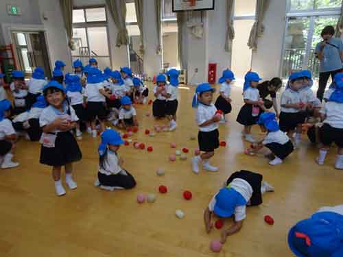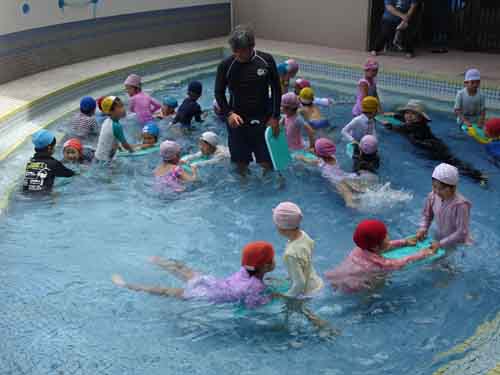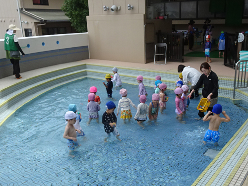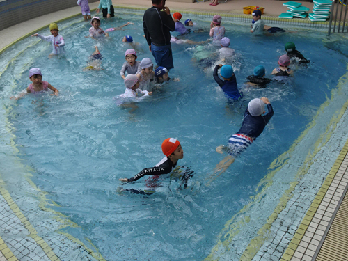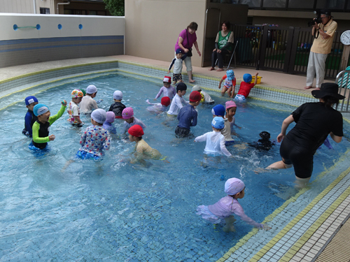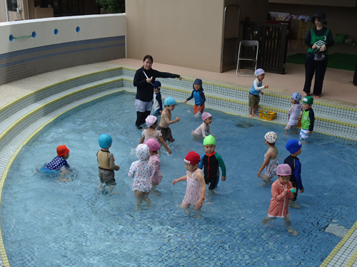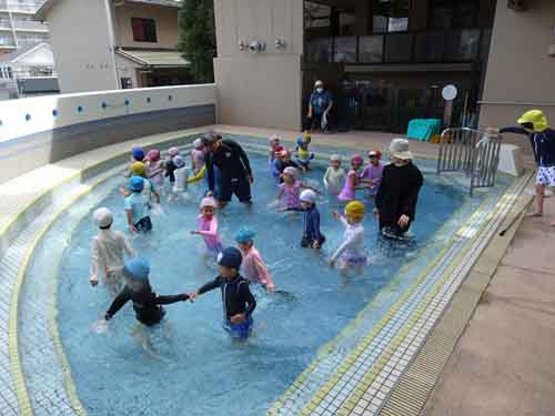 年長さんは体育遊びでプールにじっくり入り、水と戯れていました。