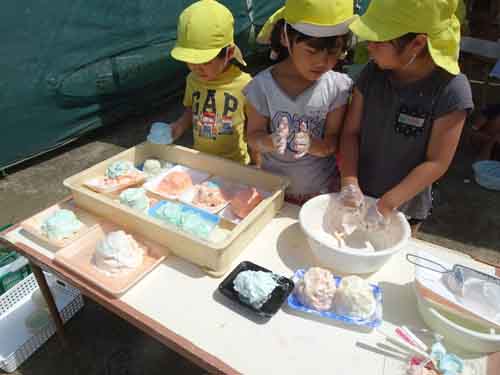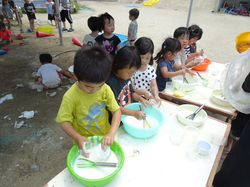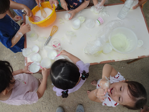 年少さんは予定のクラスが泥遊びや石鹸遊びをしました。