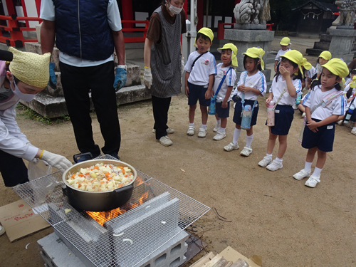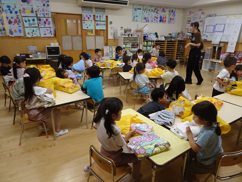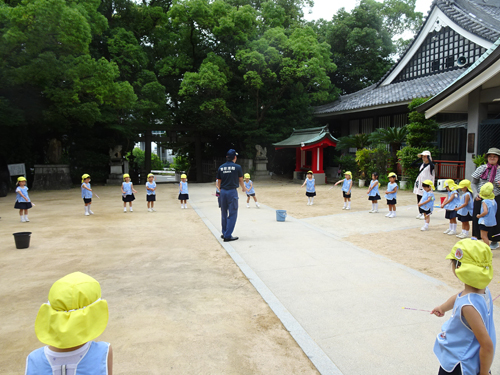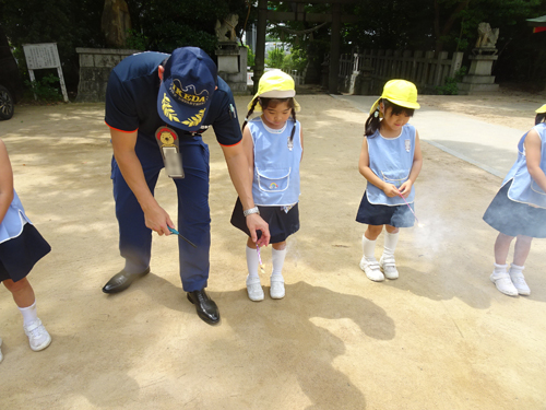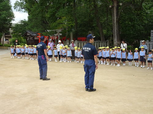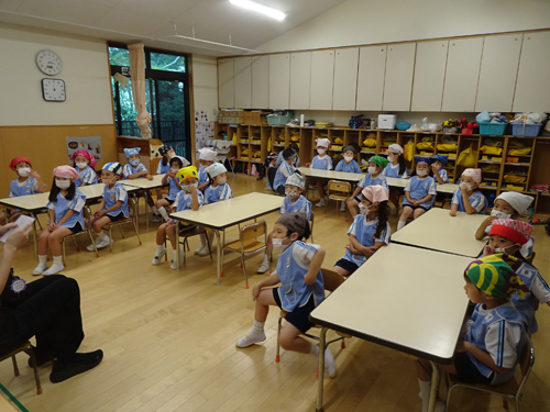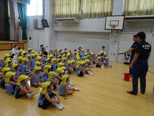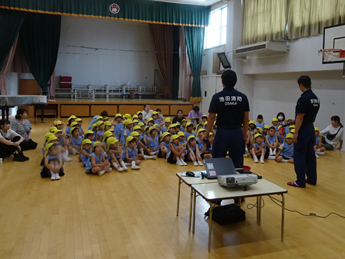 今日は池田市消防本部の消防士さんが来て、年長さん向けに防火教室を開いてくださいました。