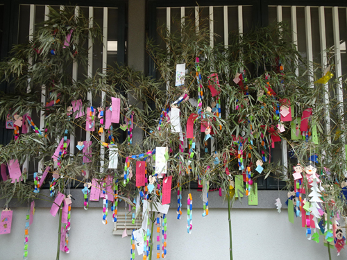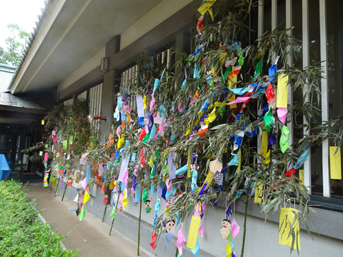 七夕まつりの大笹飾りは社務所の軒下に飾っています。