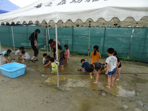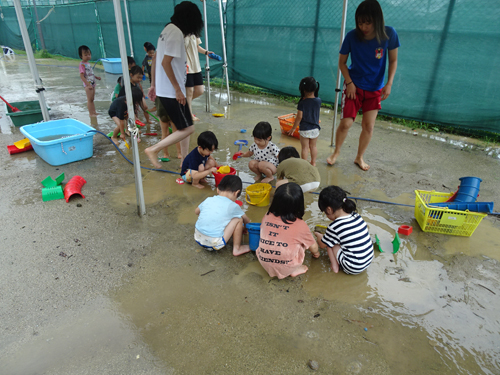 園庭での泥んこ遊び、