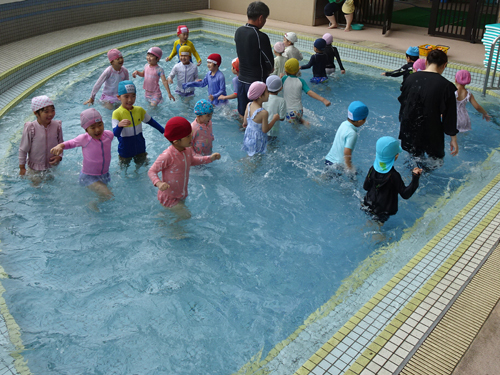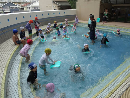 天気予報は良くなかったのですが、レーダー上、意外に雨が降らないことが予想されたため、予定のクラスはプール入水や水遊びの着替え準備をしました。