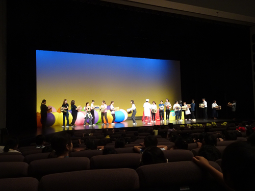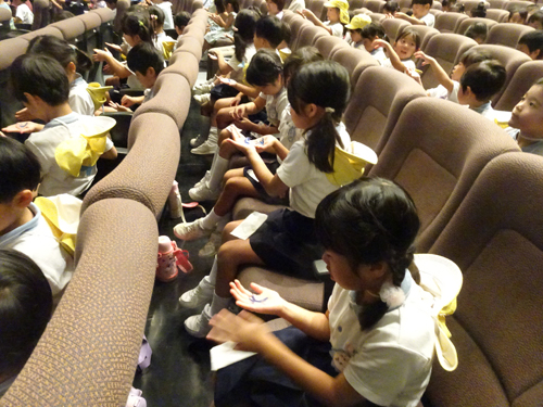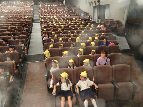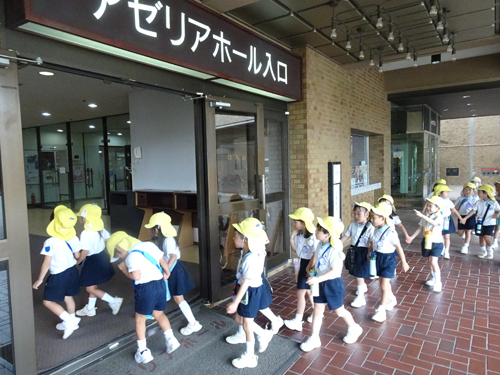 今日は年長さんが幼稚園まつりに参加するため、アゼリアホールに行きました。