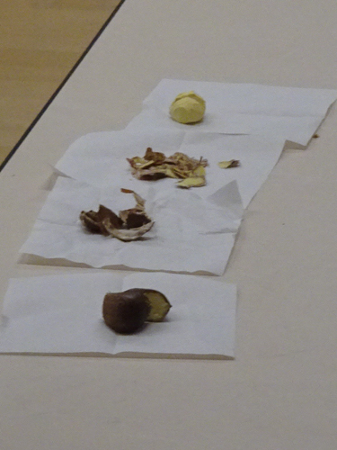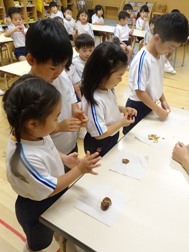 年中さんでは今日が栗ご飯ということで、栗の中身を取り出すところを調理室の先生に見せてもらったクラスがありました。