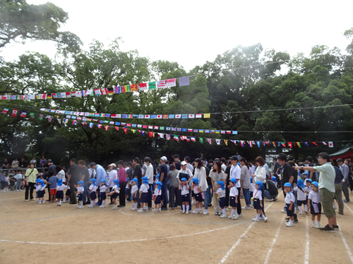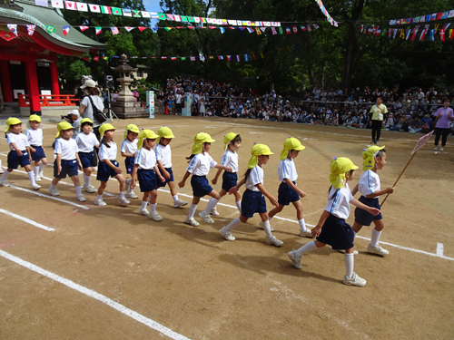 まずは年少の部です。お家の人に連れられて、真ん中に集合。