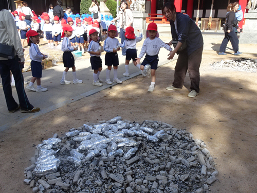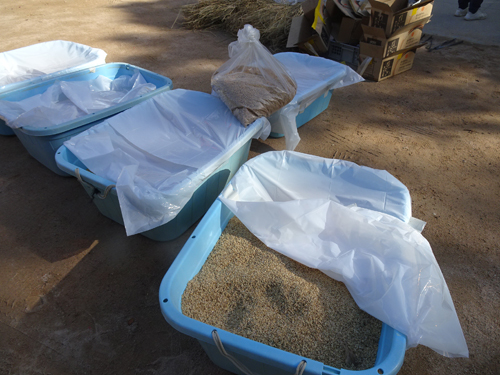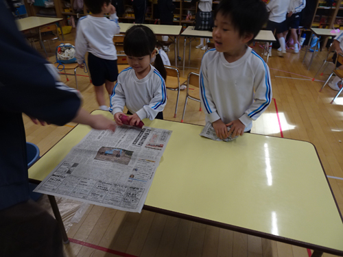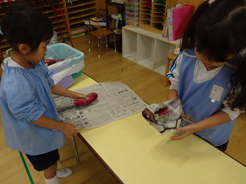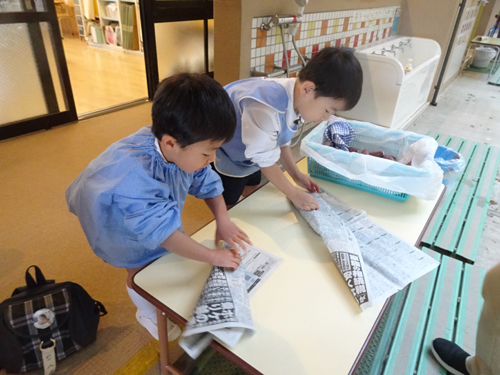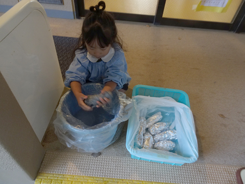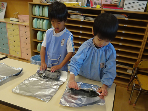 新聞紙で巻き、水に浸け、さらに銀紙で巻いていきました。