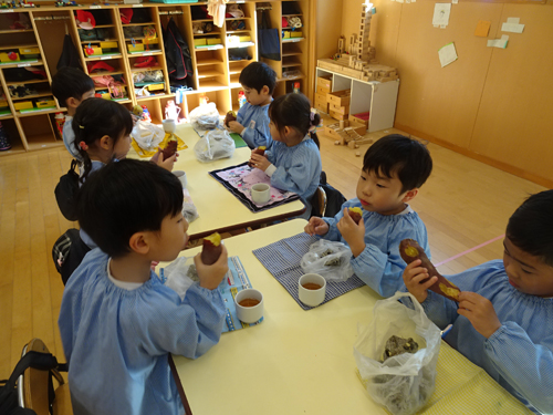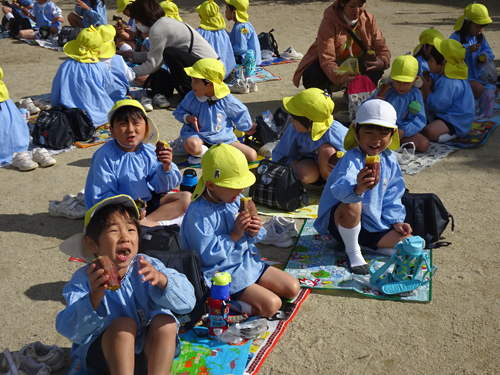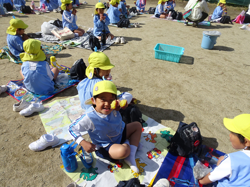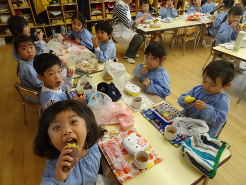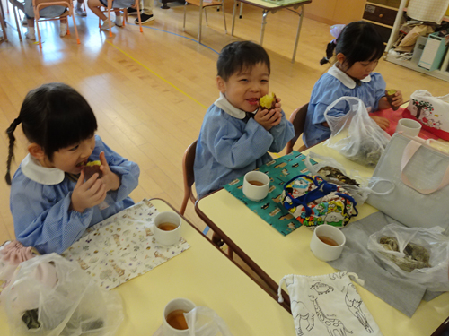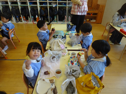 年中さん年少さんはお部屋でお弁当と一緒に食べました。