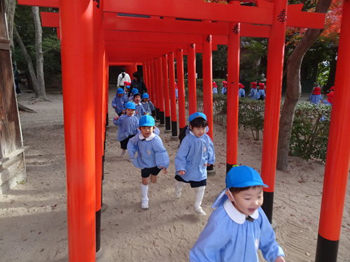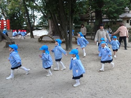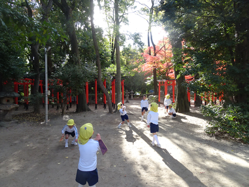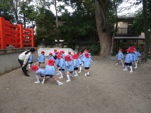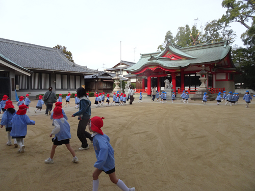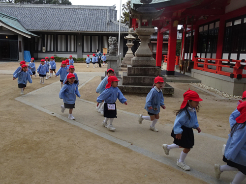 寒くなってからは、全クラスで境内や園庭を走っています。