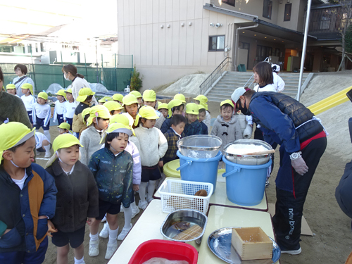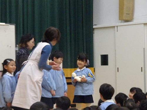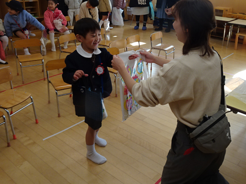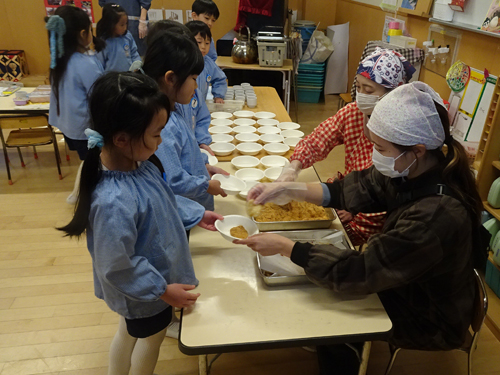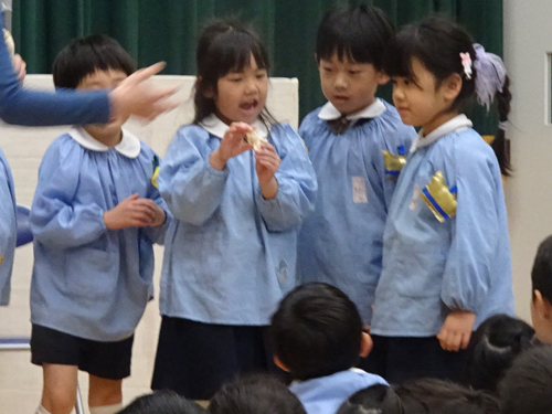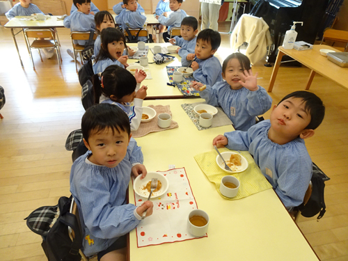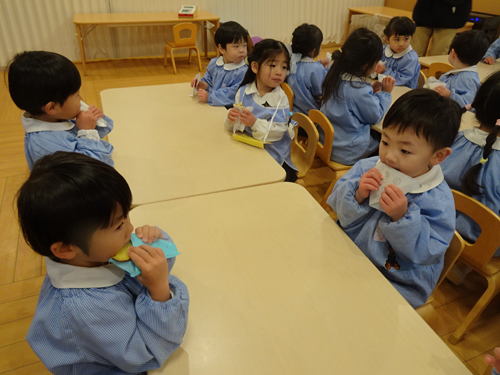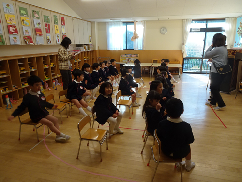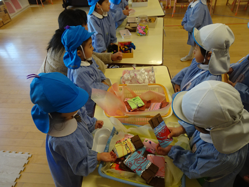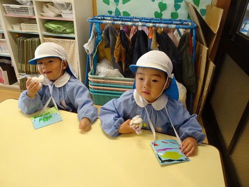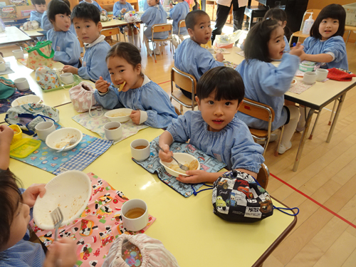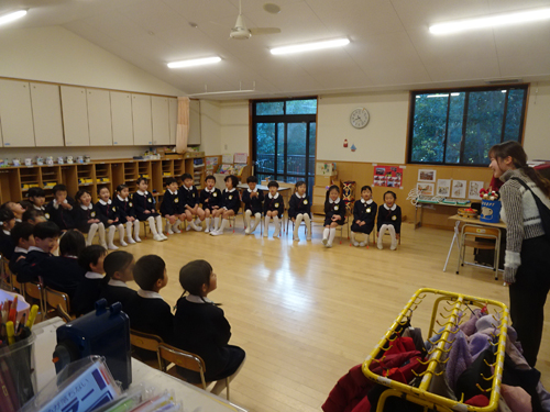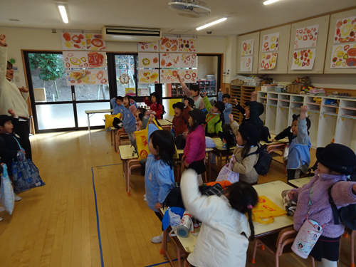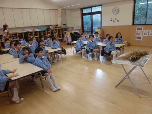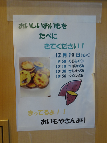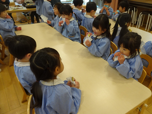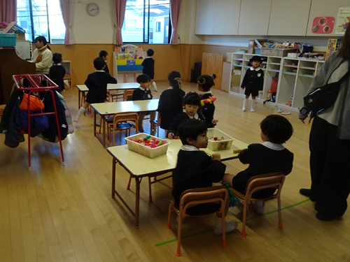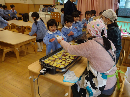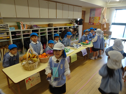 全学年が招待されていますが、今日は年少さんにおいもやさんから招待がありました。