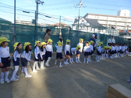 今日も年中と年少の全クラスがまずは準備運動をして、