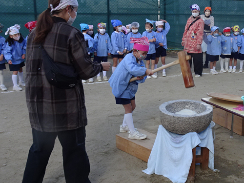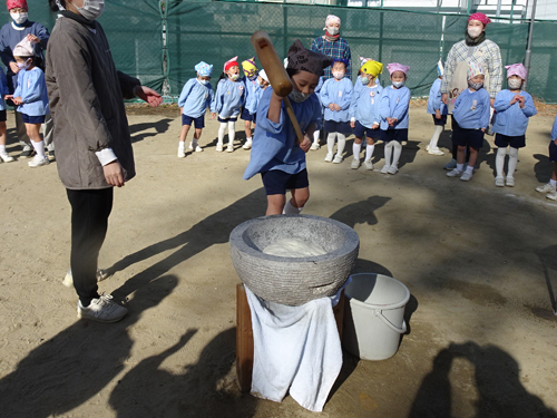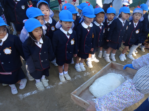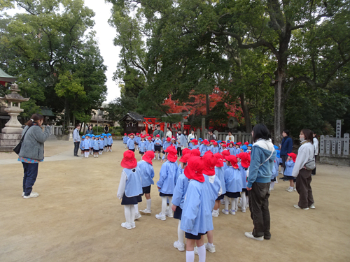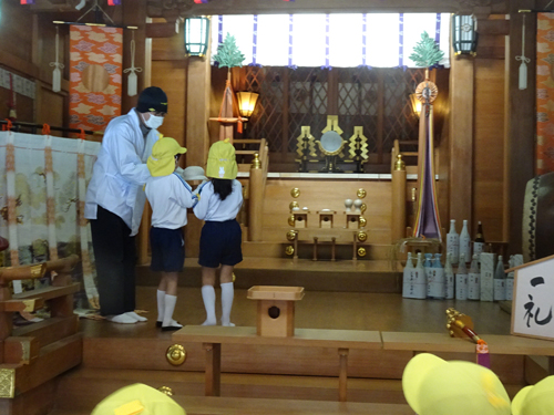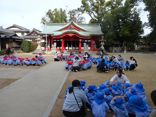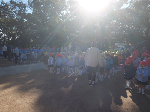 神社参拝をして、園長先生の話を聴いて、園歌を元気に歌いました。