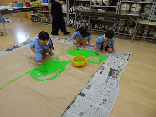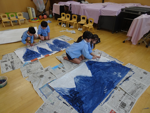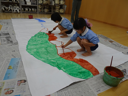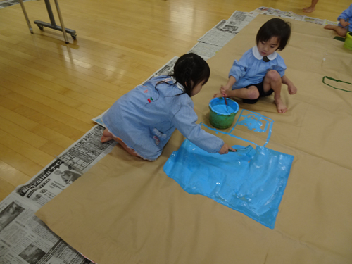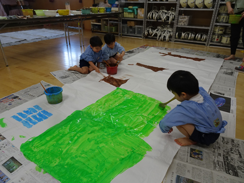 年少さんも大きな紙に劇遊びのバック絵を描いています。