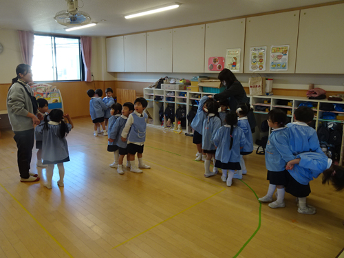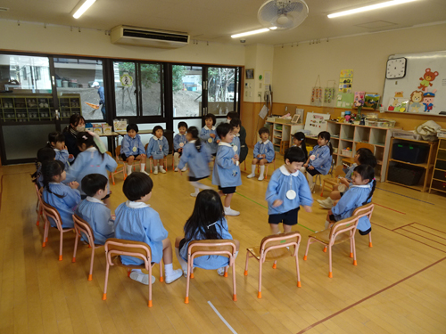 年少さんは集団遊びのフルーツバスケットに挑戦してみました。