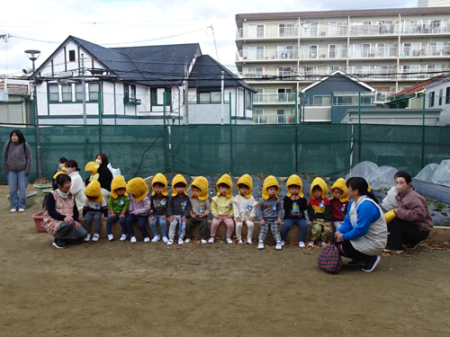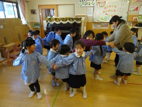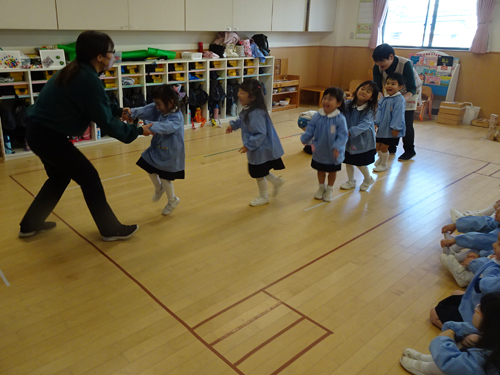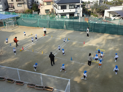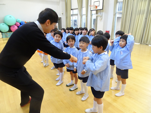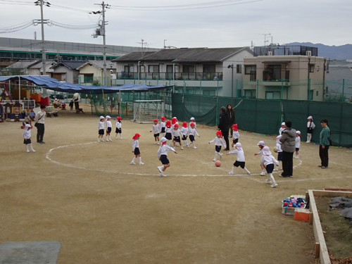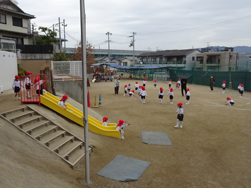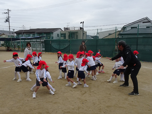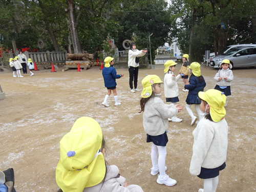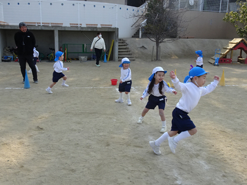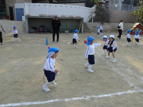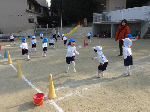 年中さんの体育遊びは寒さに負けず、園庭で行いました。