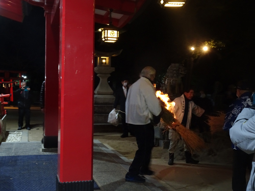 日の出前の午前6時半頃、氏子さん達がご神火をもらい点火、