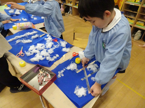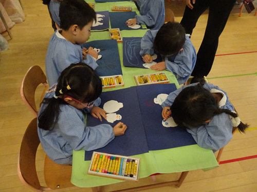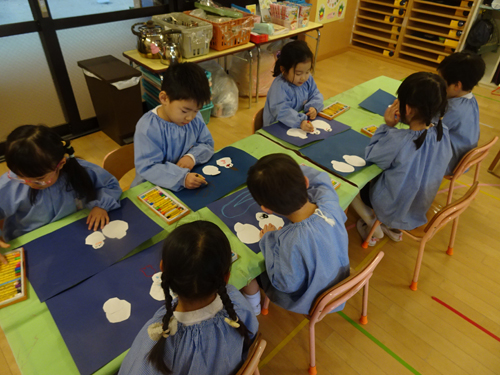 お部屋に戻り、保育活動を再開しましたが、年少さんは雪だるまの貼り絵にクレパスで加筆、