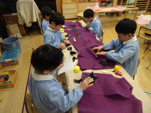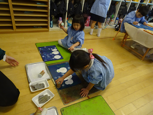 年少さんは劇遊びで着る衣装に模様をつけていました。