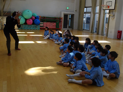 年少さんは運動講師の先生による体育遊びを園庭で行いました。